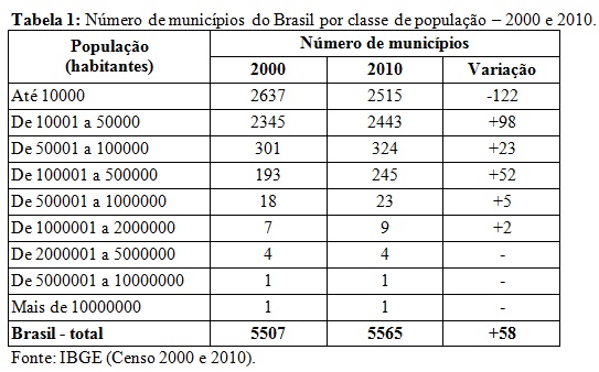 - Tabela 1: Número de municípios do Brasil por classe de população: 2000 e 2010.