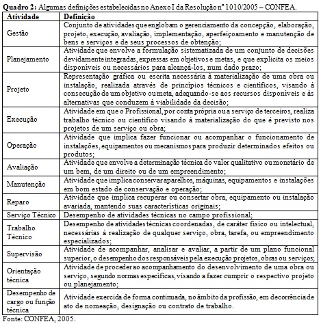 - Quadro 2: Algumas definições estabelecidas no Anexo I da Resolução nº 1010/2005: CONFEA.