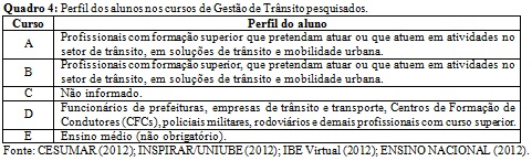 - Quadro 4: Perfil dos alunos nos cursos de Gestão de Trânsito pesquisados.