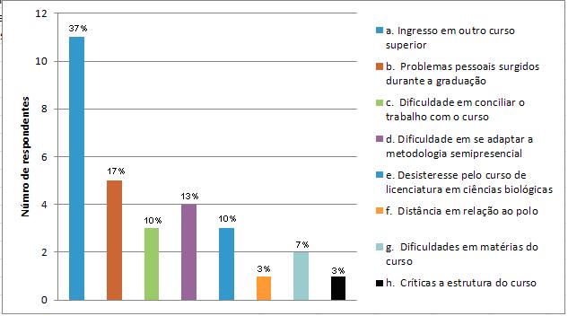 Este trabalho tem o objetivo de estudar os motivos de evasão no curso de licenciatura em ciências biológicas do polo de educação a distância do CEDERJ/UAB localizado no município de Nova Friburgo-RJ. Com esse objetivo foi realizado um estudo exploratório utilizando os dados contidos no sistema acadêmico do CEDERJ para se obter o número de alunos evadidos das dez primeiras turmas do curso, de 2006 a 2011. Posteriormente, para se estudar o motivo dos estudantes abandonarem o curso, foram realizadas entrevistas, através de ligações telefônicas, com 30 ex-alunos do curso. Os resultados indicaram que no grupo pesquisado ocorreu uma evasão de 43% que se concentrou nos três períodos iniciais do curso. Os principais motivos de evasão são relatados. Observou-se uma tendência de diminuição da evasão ao longo do tempo, o que pode estar relacionado com as ações de apoio acadêmico ao estudante que vem sendo desenvolvidas pela instituição de ensino.